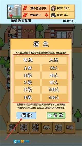 4、查看招生结果中各等级学生人数,点击【招收】按钮确认录取,补充学校生源力量,推进教学安排。
