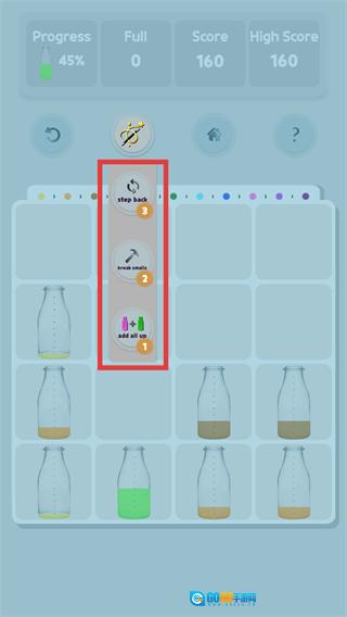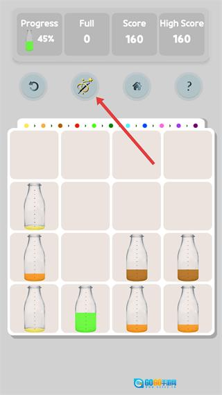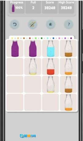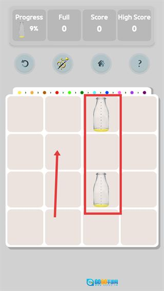2、将红框内同液体的瓶子移动合并,完成对应液体的装满进度,界面显示【Progress-9%】等数据。
