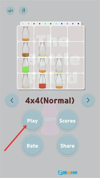 1、选择【4x4(Normal)】模式,点击【Play】进入游戏,界面显示带有不同液体的瓶子,开启装满瓶子的挑战。