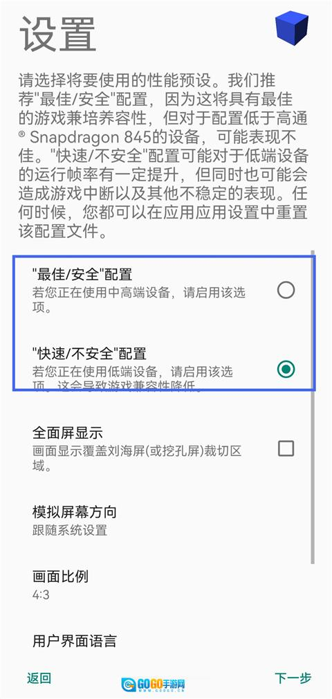 2、中高端设备可选用【最佳/安全配置】,较低端设备建议选用【快速/不安全配置】。