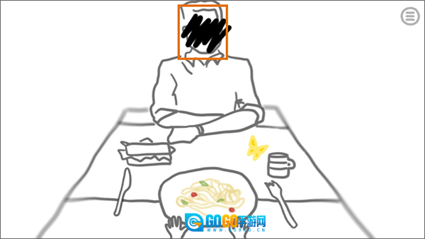 然后点击它的脸让它的面容浮现出来(就是变得清晰些不要在意细节),先让蝴蝶飞到男人肩膀头子上↖然后他脸就出现了,而后点击蝴蝶让它飞到不知道叫什么(也许是三明治)的上边在让蝴蝶使它到杯子附近变成↓这样(不要问为什没有到肩膀头子和三明治的图因为实在截不动了)。