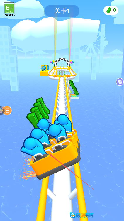 进入《过山车之星2》的第一关,发现右上角的金钱数值显示为0,于是操控过山车向前行驶,收集沿途的钞票。