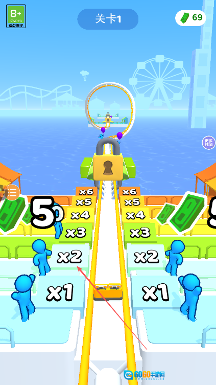 在游戏进程推进到第一关的后半段时,你会发现一些被锁住的机关,以及带有倍率标记的特定区域。为了让收集到的资源数量有所增长,需要操控过山车从这些倍率区域穿行而过。