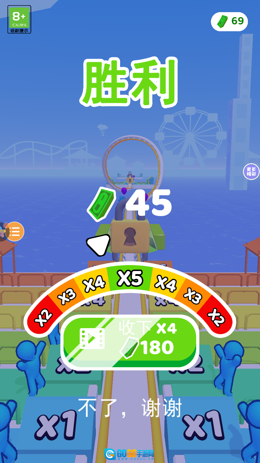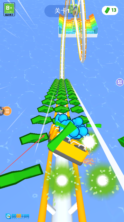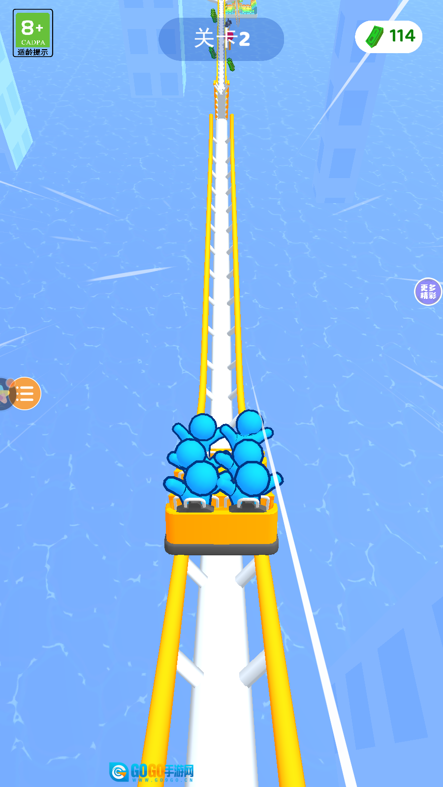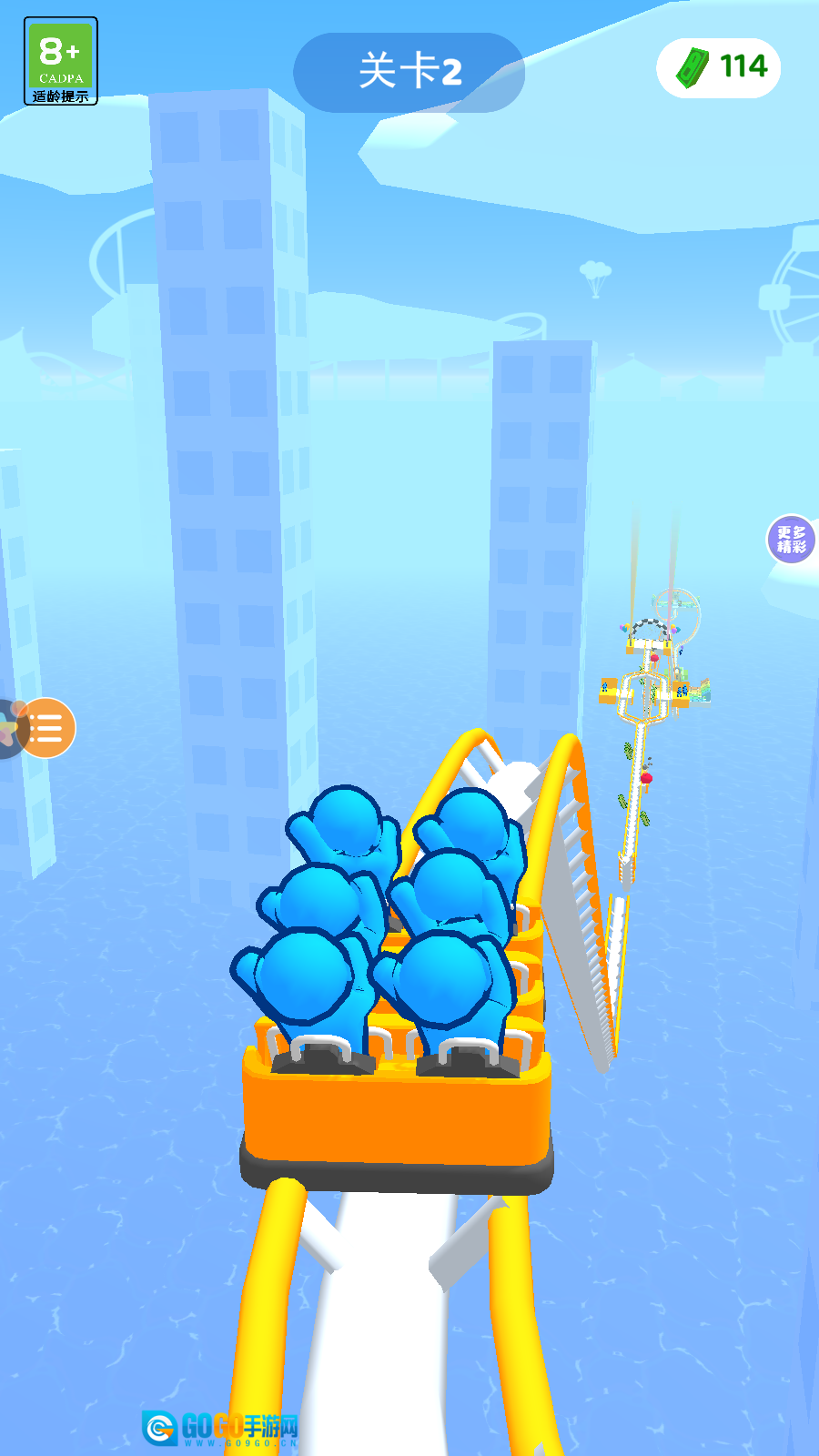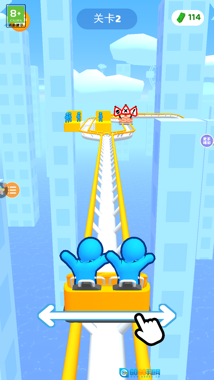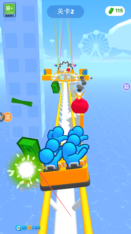 进入第二关后,继续操控过山车收集钞票,在此过程中要留意并避开红色炸弹之类的障碍物,不断积累金钱。