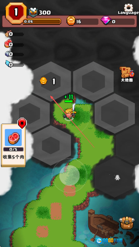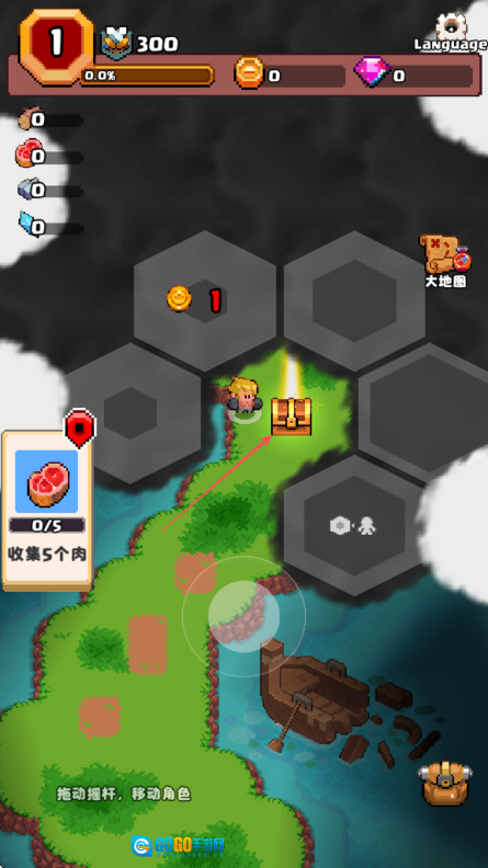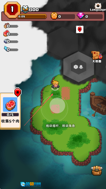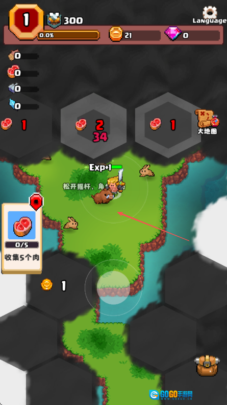 进入山谷冒险者游戏界面后,能看到左上角显示着数字1等相关信息,左侧还有提示需收集5个肉的指引,接着拖动屏幕上的摇杆就可以操控角色移动。