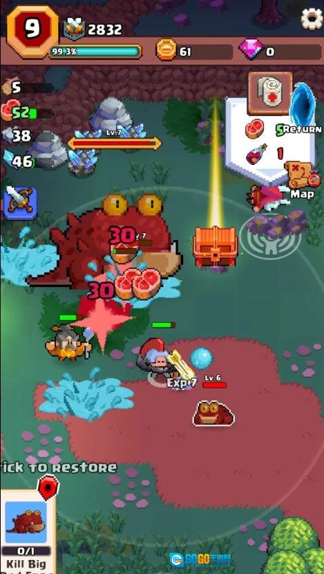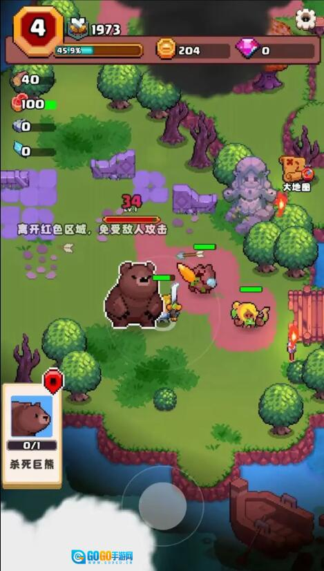 当遇到野猪这类动物时,攻击它们会出现Exp的提示,此时松开摇杆就能收集掉落的肉,从而完成任务。