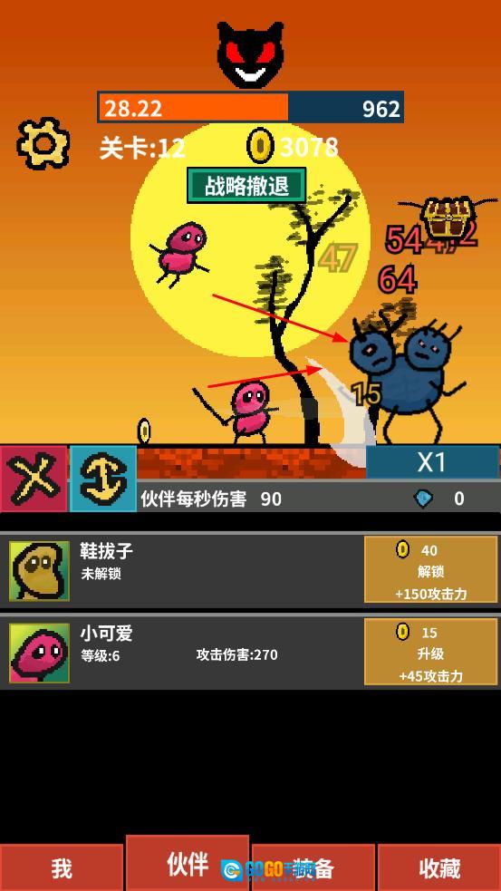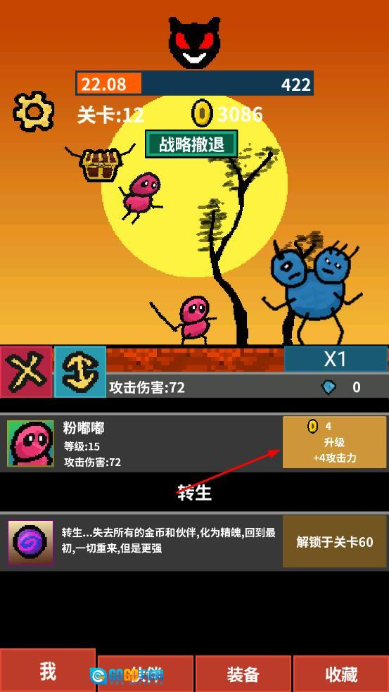 提升伙伴等级,还能解锁全新伙伴,从而增强战斗能力。后续在60级关卡可解锁转生功能,虽然会失去金币和伙伴,但能让自身变得更强大。