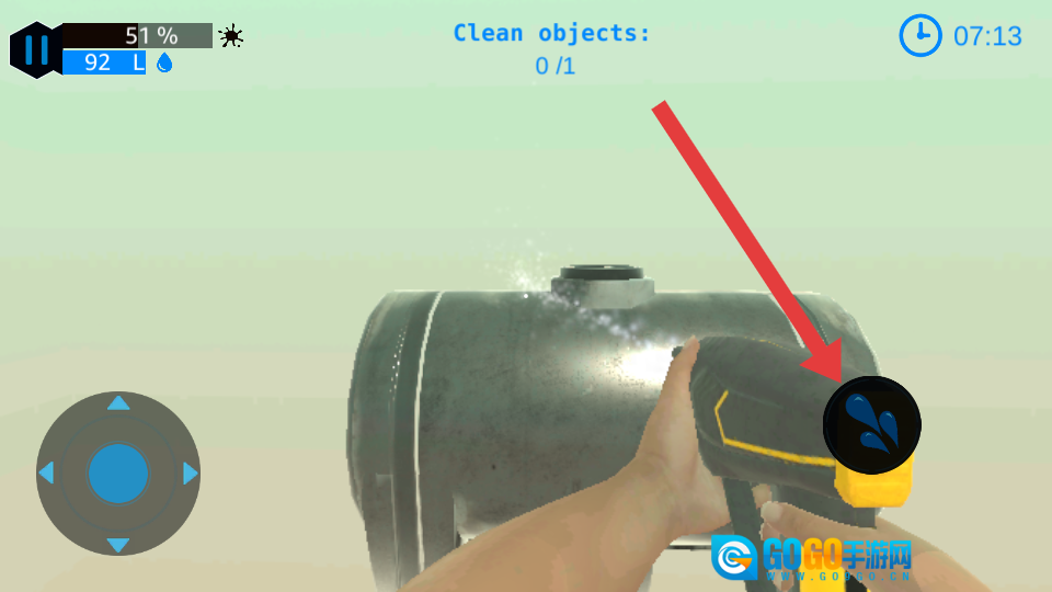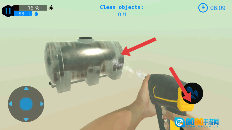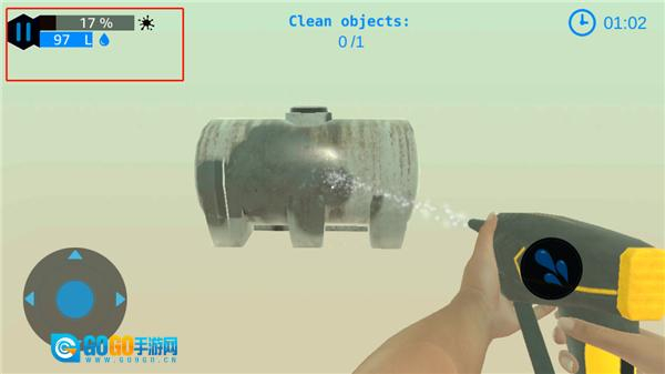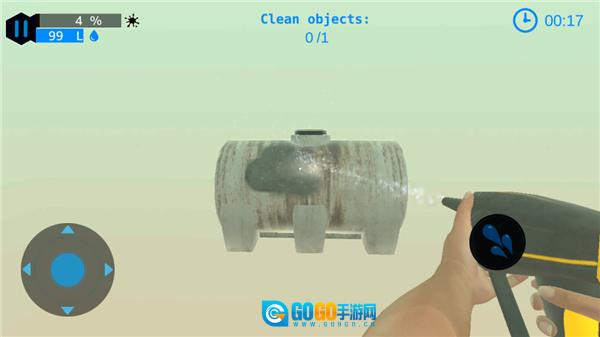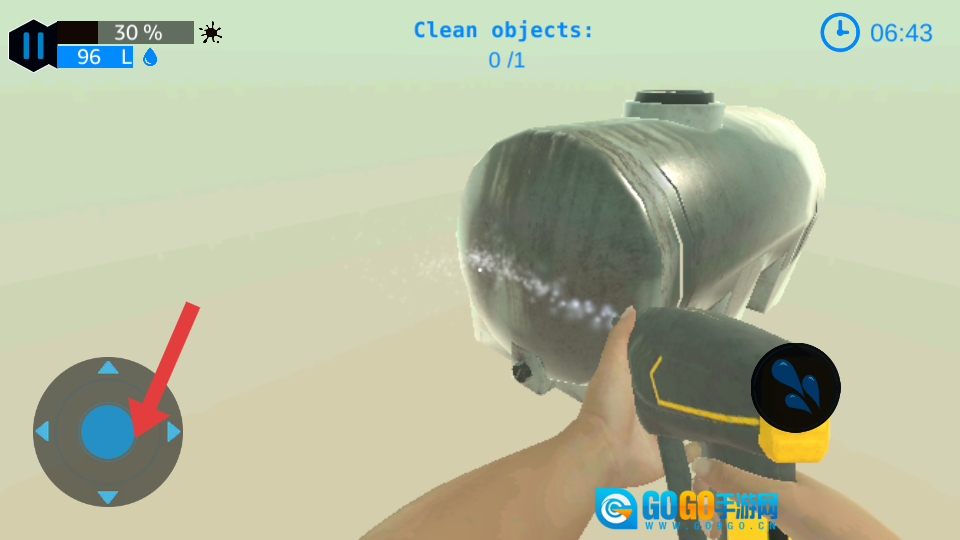 进入清洁类模拟游戏后,先熟悉操作方式,利用左下角的虚拟摇杆操控角色移动,对准需要清洁的金属罐体之类的目标。