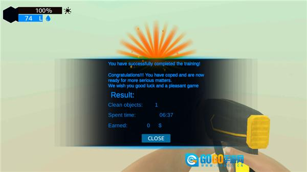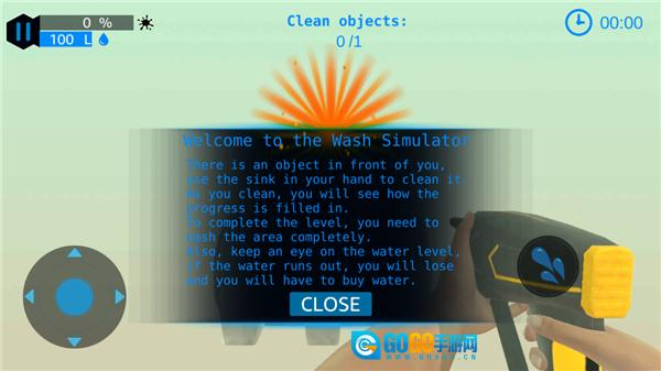 基础流程操作说明如下:完成安装后进入主界面,点击“开始”按钮,从第一关起依次解锁后续关卡;查看任务界面后将其关闭,之后通过右侧的水滴按钮进行清洁操作,同时借助左侧的控制键来调整视角。