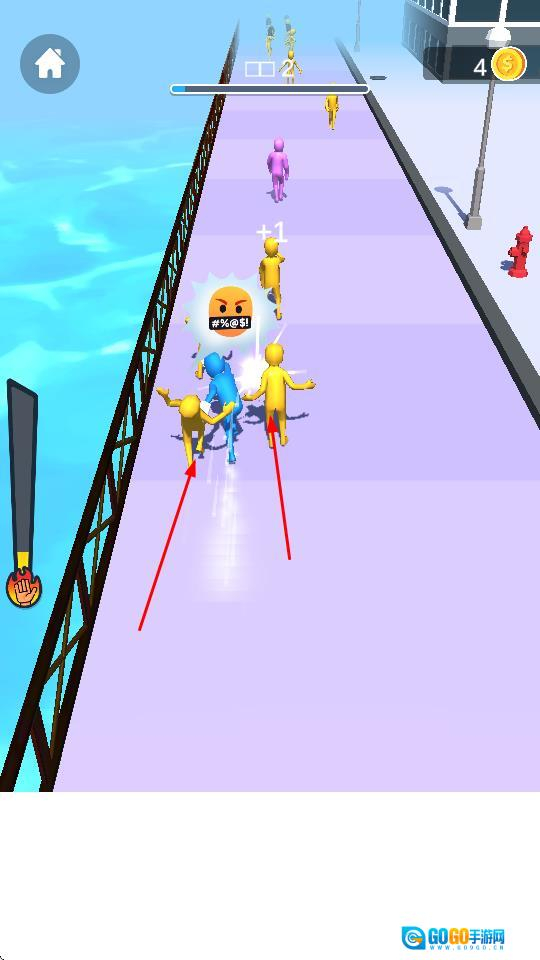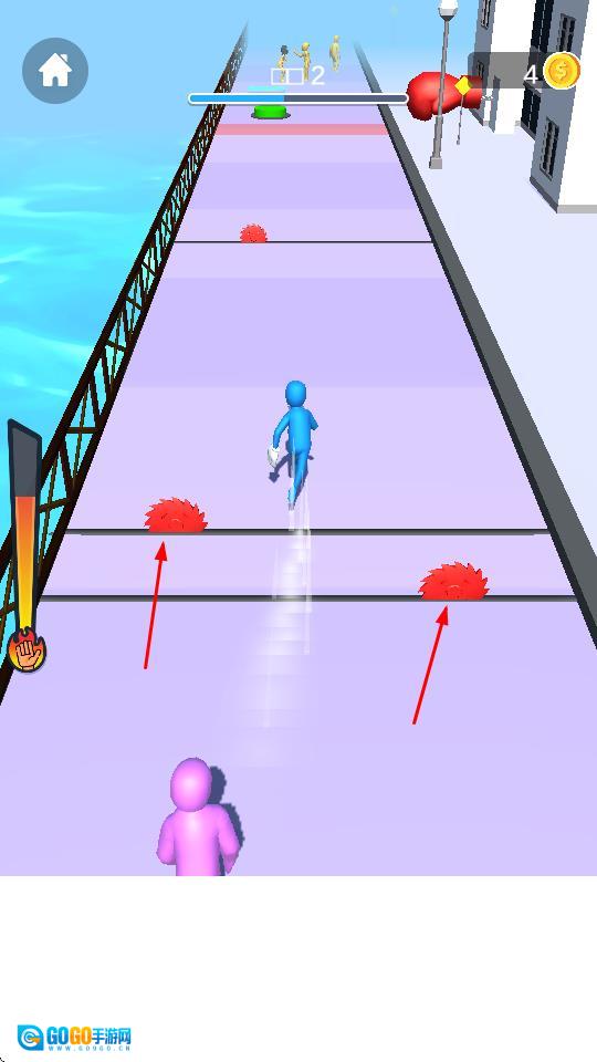 当碰到黄色角色时,通过触发互动能让计数增长,与此同时要躲开红色尖刺之类的障碍物,确保角色可以顺利向前行进。