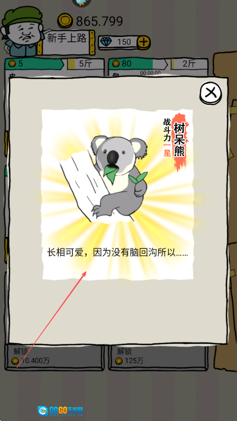 当你攒够720个金币后,点击树呆熊来解锁对应的区域。成功解锁之后,就可以查看树呆熊的战斗力、一星等相关信息了。