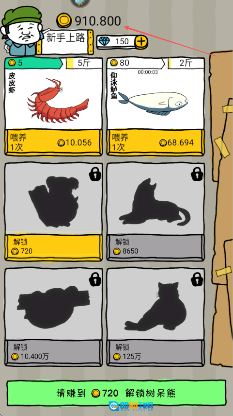 当金币积累到910800时,你可以再次选择喂养已解锁的动物,也可以继续积攒金币,为解锁更高级的动物做准备。
