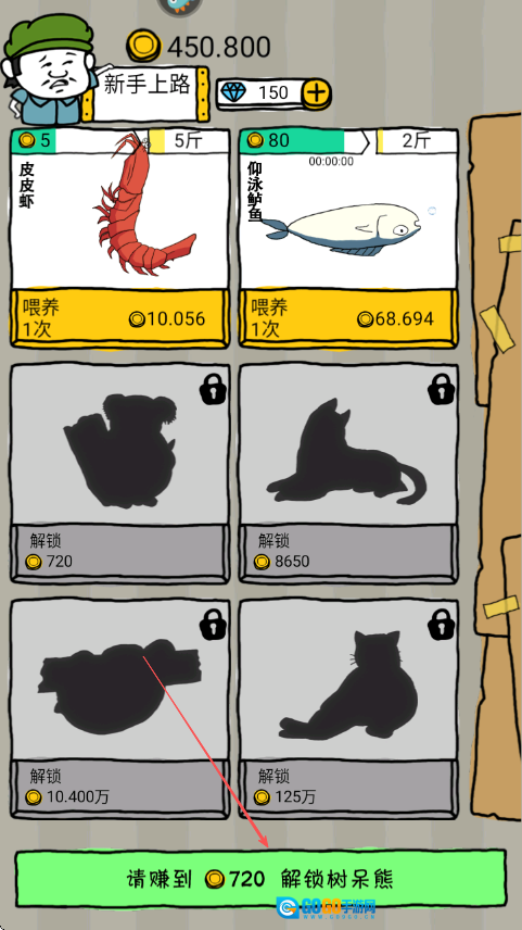 打开皮皮虾传奇这款游戏,在界面顶部能看到450800的金币数值和150颗钻石。点击喂养皮皮虾的按钮,会消耗10056金币,以此来增加皮皮虾的重量。