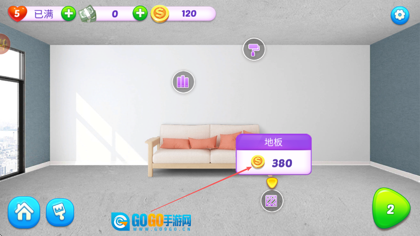 装饰地板时,点击地板图标,花费380金币挑选合适的地板样式,即可完成房间地板部分的设计与装饰。