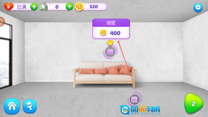 打开小家设计游戏,看到界面顶部的红心进度条已完全填满,当前钞票余额显示为0。点击墙壁相关的图标后,消耗400金币完成了墙壁装饰的购置操作。