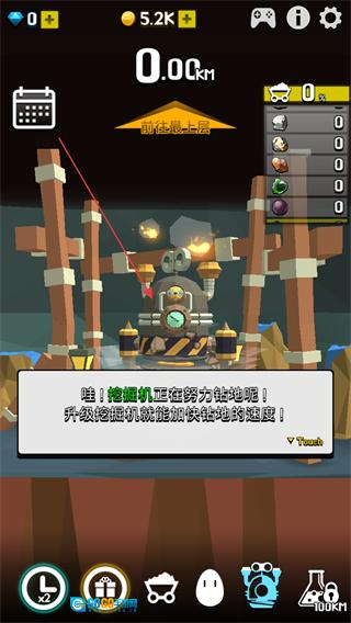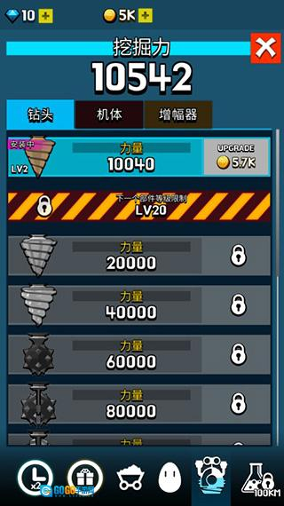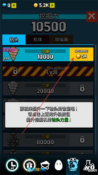 1、点击挖掘机界面的升级提示,进入钻头升级页面,消耗5K金币并点击UPGRADE按钮,即可提升钻头的力量。