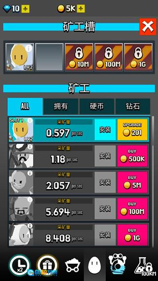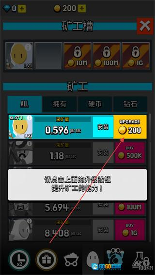 3、点击底部的矿工图标,进入矿工槽界面,选择你已拥有的矿工,消耗200金币后点击UPGRADE按钮,即可提升该矿工的能力。