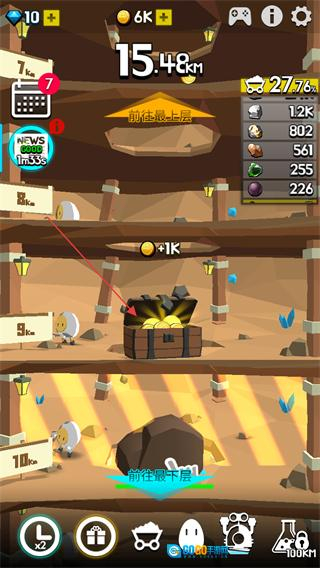 4、开启宝箱可获取1K金币等额外奖励,之后继续向下挖掘,以此提升挖掘进度与资源收益。