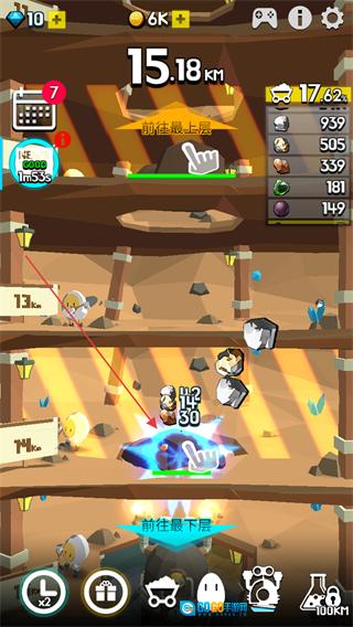 3、不断敲碎每一层的岩石,积累资源并解锁更深处的地层,与此同时收集掉落的物品,比如宝箱。