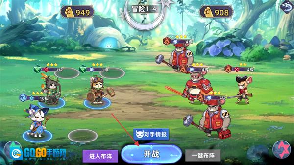 3、进入冒险1-4的战前界面后可查看对手情报,了解敌方信息再点击开战按钮开启战斗,也能选一键布阵快速配置阵容。