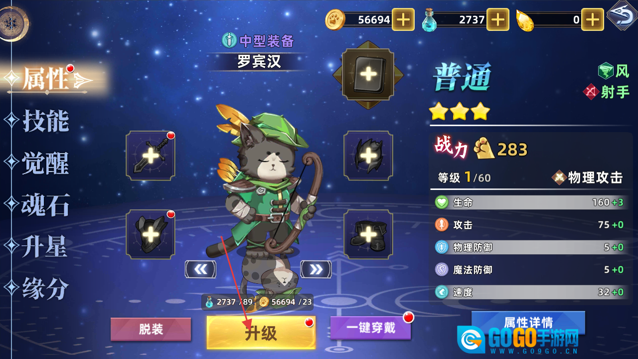 1、在罗宾汉的角色界面中可点击升级按钮,消耗对应资源提升角色等级,还能通过一键穿戴配置装备来增强该角色的战力属性。