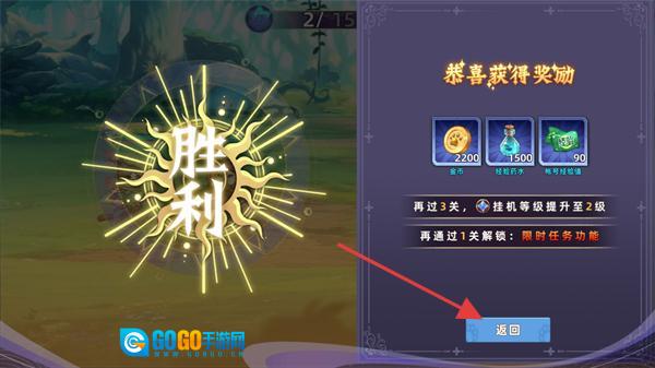 4、冒险关卡战斗获得胜利并显示奖励内容后,点击界面中的返回按钮,即可回到冒险界面继续挑战后续的相关关卡。