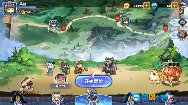 2、在主界面点击底部的冒险选项,进入冒险页面后确认当前可挑战关卡,点击开始冒险按钮就能进入对应的冒险关卡开展挑战。