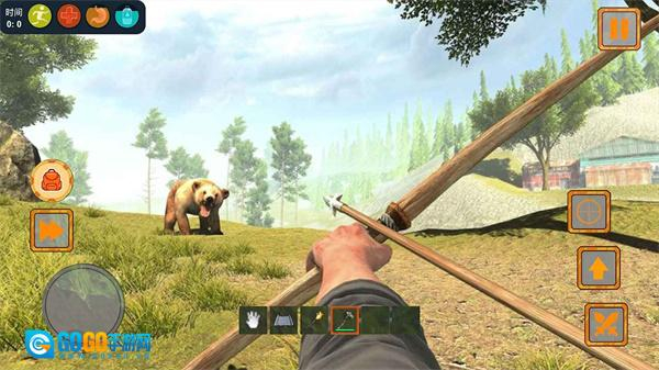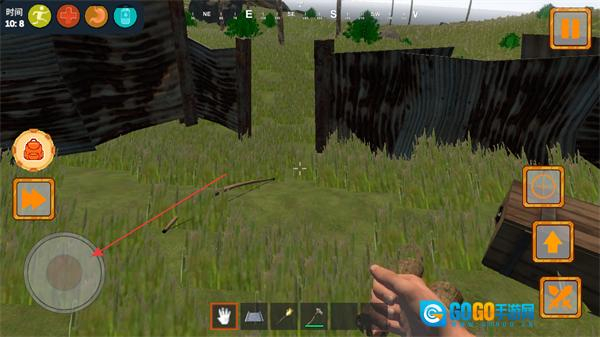 1、通过操控虚拟摇杆来控制角色移动,让角色靠近场景里的木弓等道具。