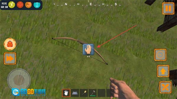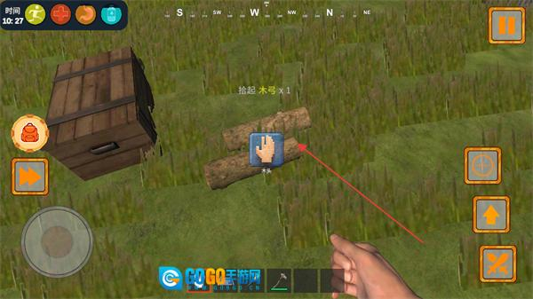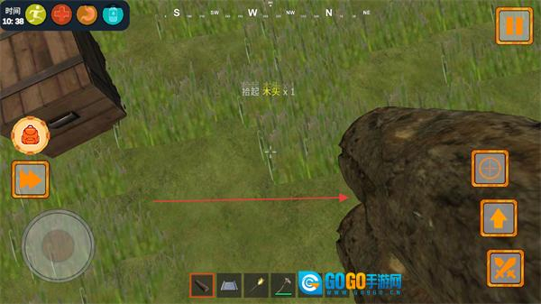 2、点击道具上的拾取按钮,即可获取木弓、木头等生存物资。