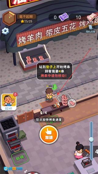 2、走到烤架旁边开始烤制烤串,点击加速按钮可以加快烤串的速度,以此来满足顾客需要4串烤串的需求。