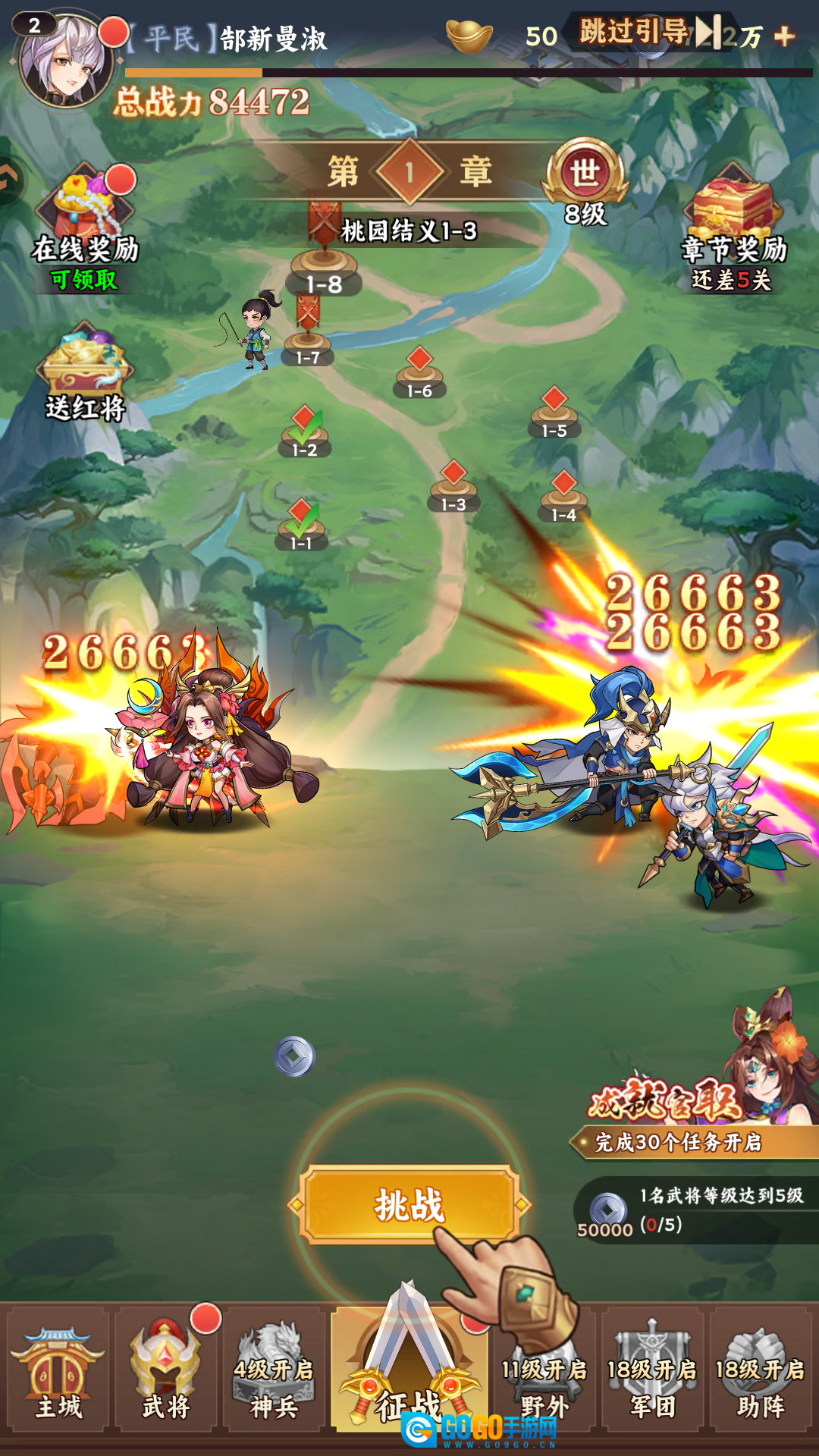 1、升级: 消耗粮草提升武将等级,基础属性提升。优先提升主力阵容。