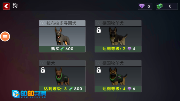 在主界面点击“狗”,可以查看可解锁的警犬种类,还能挑选不同的警犬与自己一同执行任务。