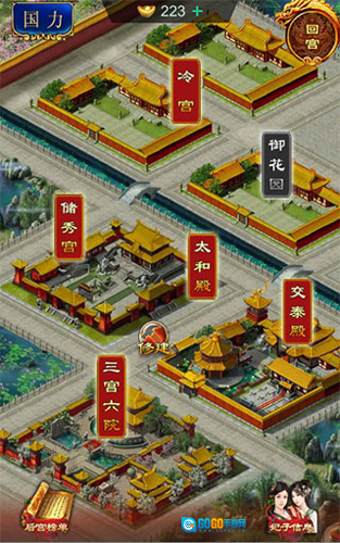 后宫包含三宫六院、交泰殿、储秀宫、太和殿、御花园与冷宫。值得注意的是,太和殿需达成征服世界1-6的进度方可解锁,御花园则要求后宫势力值累积至一万才能开启。