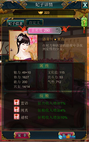 每位妃子的属性各有不同,若想解锁这些属性,就得努力增进亲密度。一旦亲密度满足要求,对应的属性便能解锁。而提升亲密度的方式包括赏赐、跑马等活动。