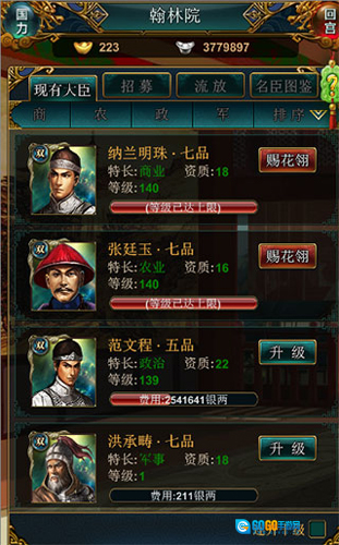 臣子的培养场所是翰林院,初始阶段会配备4位大臣,每位大臣均从一级开始逐步晋升。