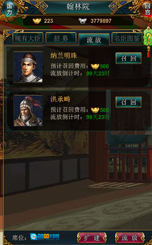 注1:大臣被流放满100天后,可免费重新启用该大臣。(若要提前召回,则需缴纳一定数量的元宝)