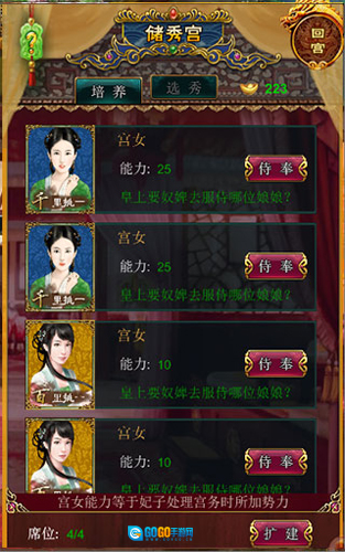储秀宫是宫女培训的场所,分为选秀和培养两大板块,流程为先选秀再培养。宫女按等级分为百里、千里、万里三种,不同等级的培养时间不同,且能力加成与培养时间相对应,具体培养时长为百里>千里>万里。
