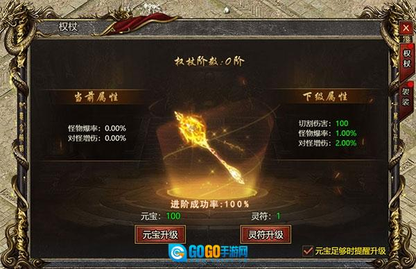 2、首先我们来介绍权杖法器,权杖阶数 一共分为20阶,主要攻击属性,有切割伤害加成,怪物爆率加成以及对怪增伤加成,升级权杖法器需要消耗一定的元宝,或者是消耗一定的灵符来进行升级,提升的阶数等级越高,进阶成功的概率会慢慢越低。