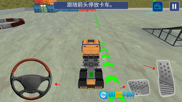 8、第三关难度升级,需要操纵方向盘、油门、刹车来将卡车放到箭头指向的位置。