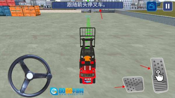 5、第一关的目标就是跟随箭头将叉车停到指定的位置上,操作油门、刹车。