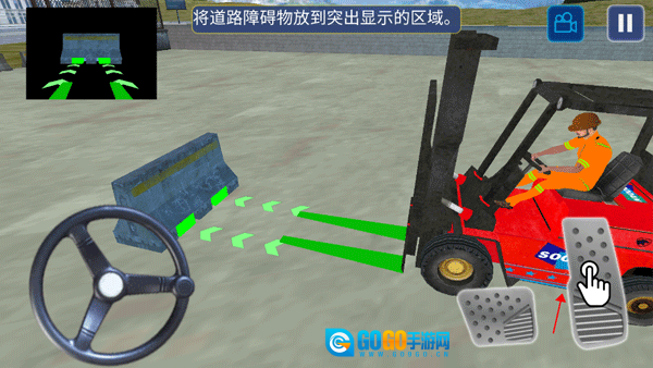 6、第二关是将道路上的障碍物放到突出显示的区域,点击油门将叉车靠近到障碍物。