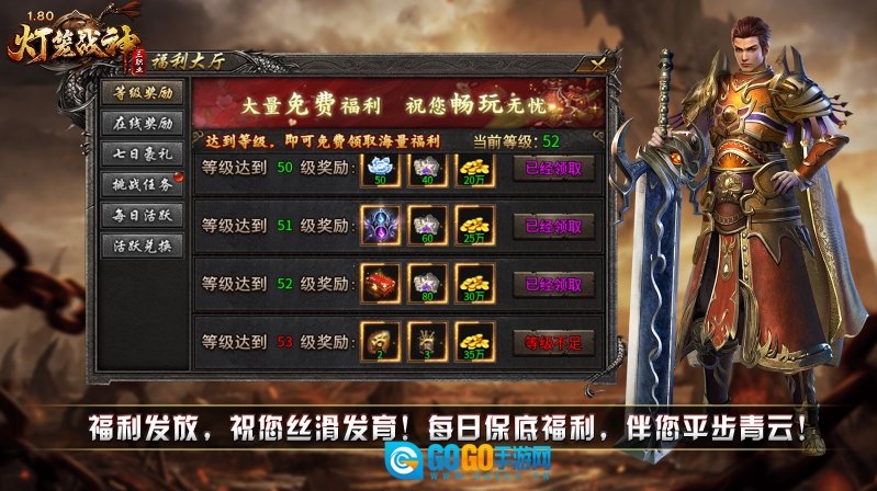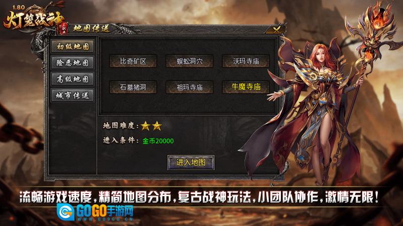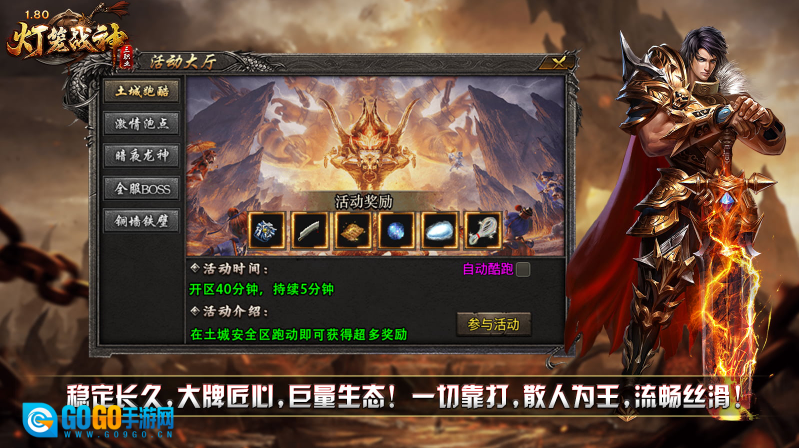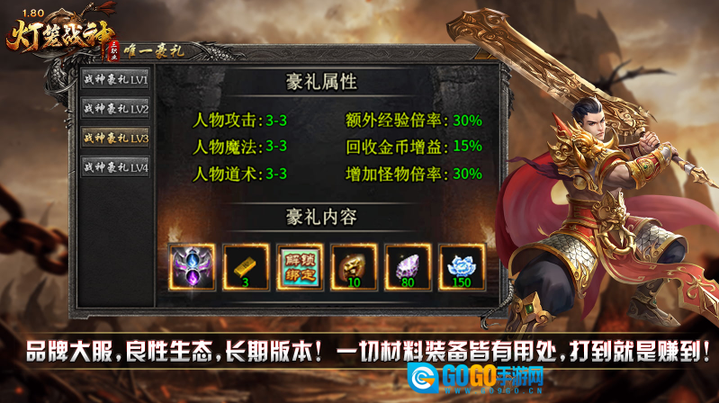 灯笼战神180,是经典复古的三职业版本,主打回归初心、简单耐玩,游戏里没有时装、生肖系统,也无顶榜、捐献等付费玩法,所有资源都靠打怪获取!本服内的每一种材料都有其用途,仅需金币就能提升各项成长,而且所有装备均可通过打怪爆出,每个人都有追梦极品装备的机会!此外还有等级奖励、在线奖励、七日豪礼等丰富福利免费领取,为你的发育之路保驾护航!只要肯花时间,散人玩家同样能在游戏中成为一方霸主!