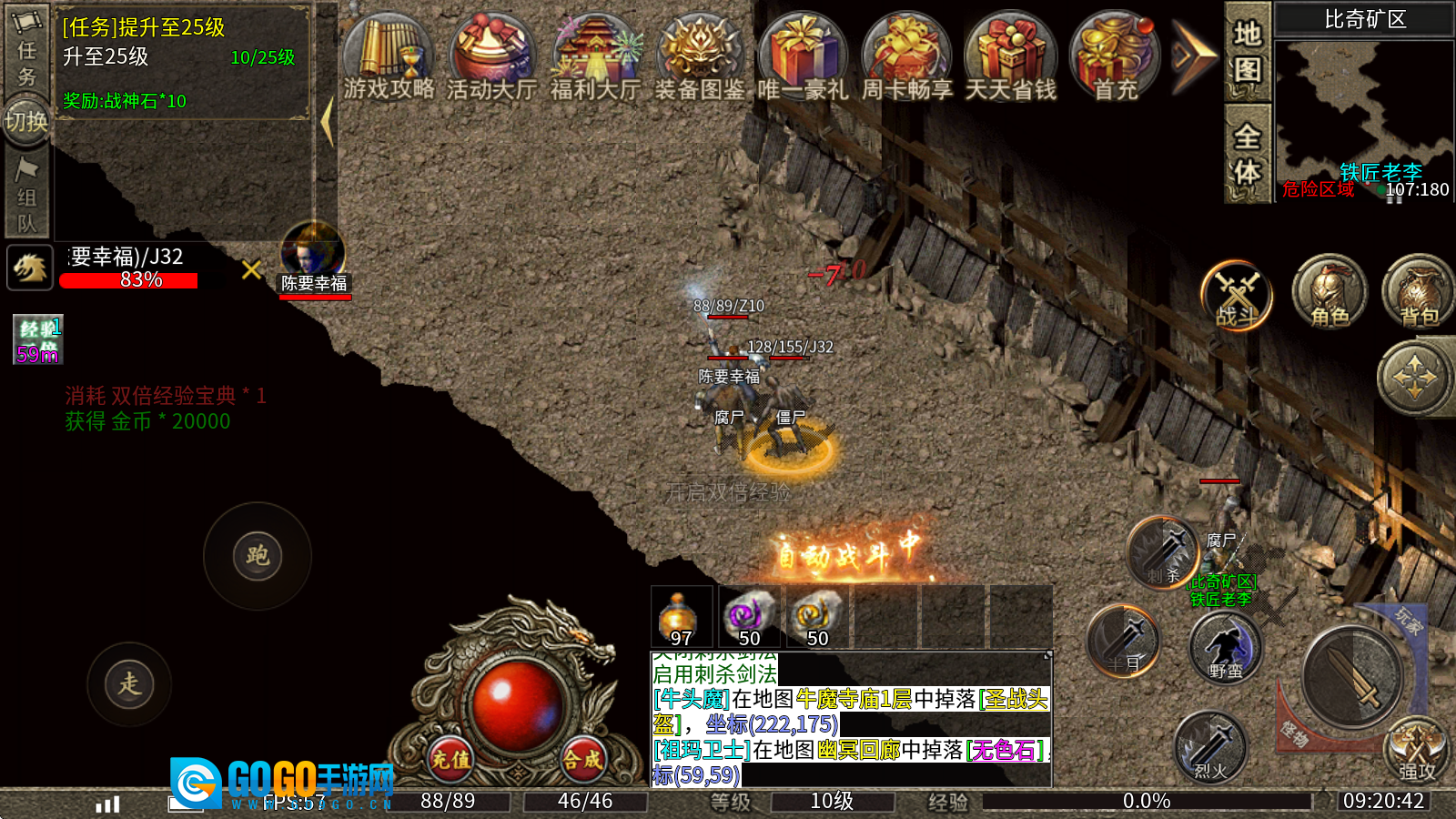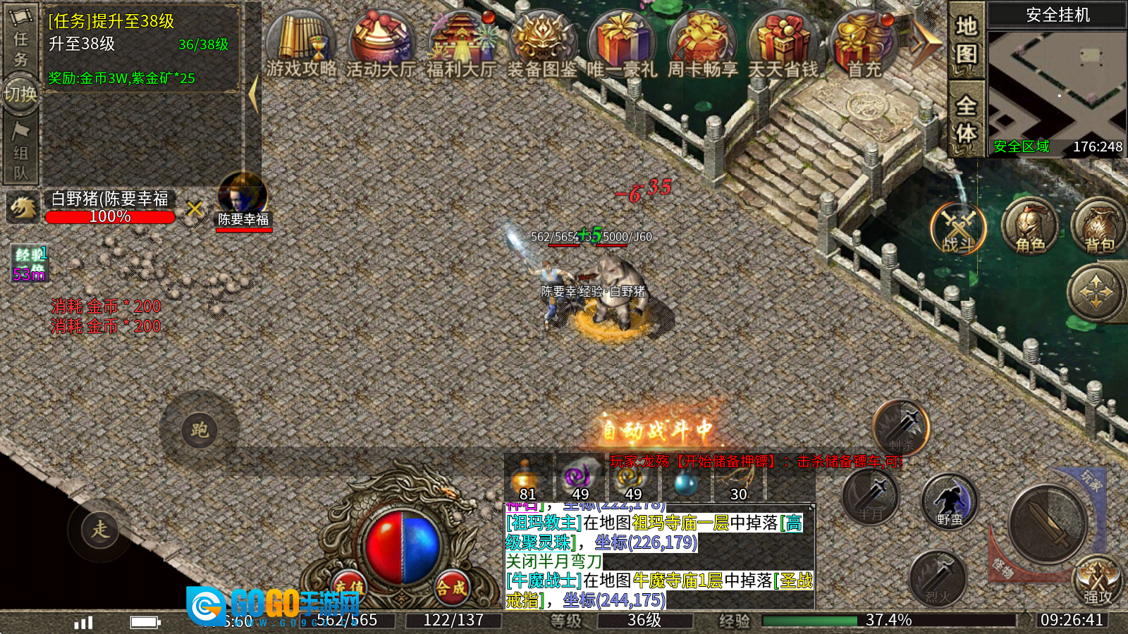 药品系统:药王谷,不管是充值玩家还是免费玩家,每日都有福利发放,包含大量金币和药品(副本产出的药品无需繁琐拾取,直接绑定进入背包),药品支持叠加,不会占用过多背包空间。角色佩戴血石后,打怪时可以实现零消耗!