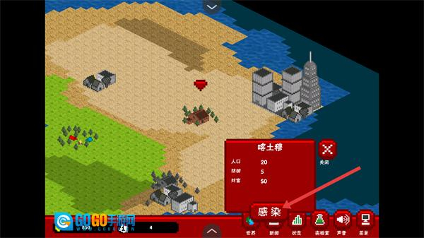 4、完成关卡后查看感染数据,点击【电源开关】回到世界主界面。