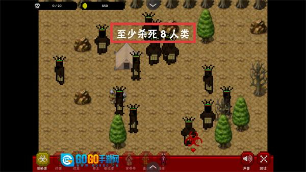 2、关卡目标为“至少杀死8人类”,操控感染体移动至人类聚集区(如帐篷周边),接触人类完成感染击杀,积累击杀数。