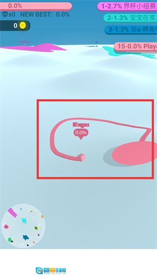2、关卡中控制粉色纸片移动,通过覆盖场景区域来积累进度(界面显示“0.0%”等进度值)。
