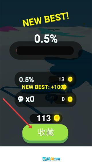 4、结束后界面显示“NEWBEST!”,点击【收藏】领取金币奖励,记录当前最佳进度。