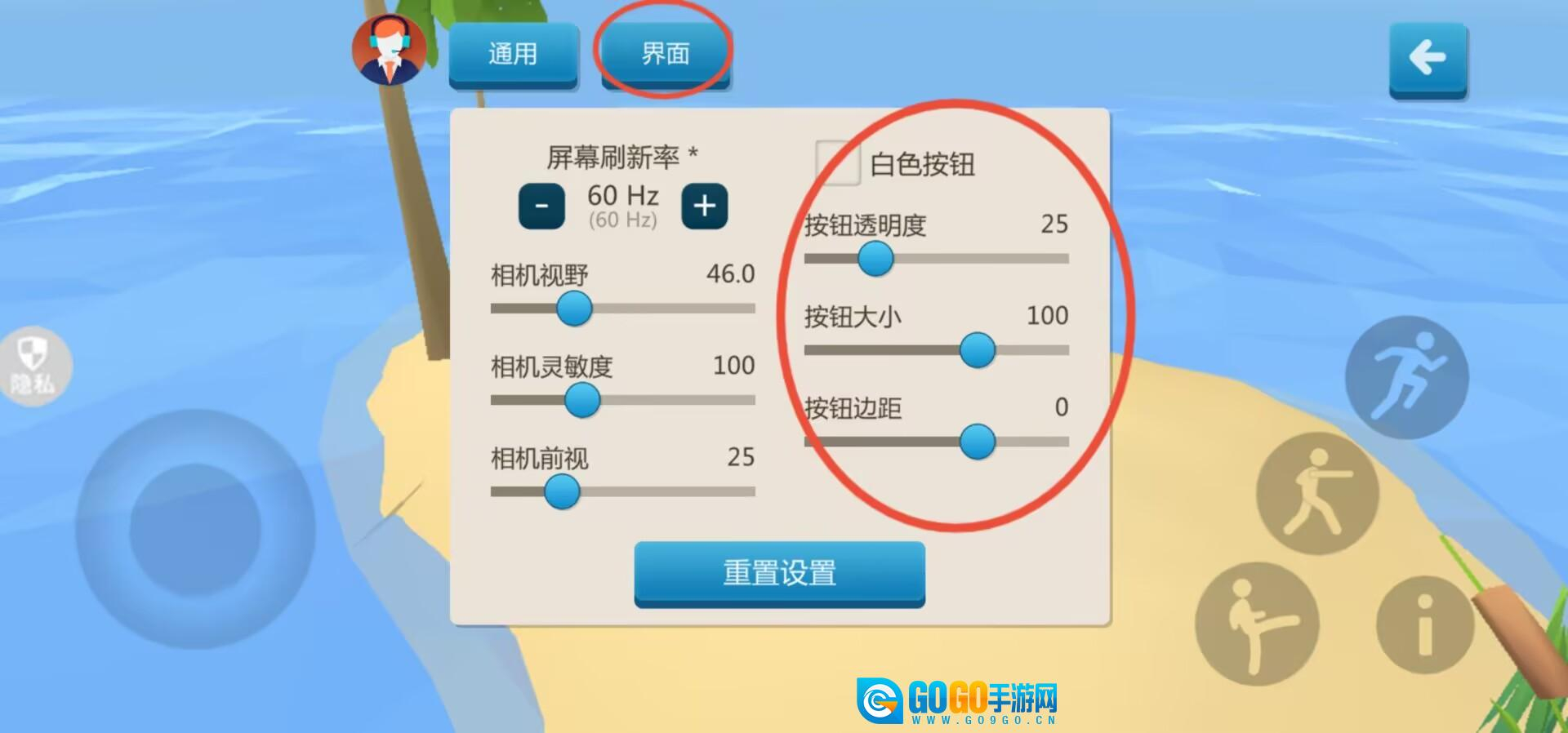 可以在设置界面调整操作按键的相关参数,界面右侧的调节选项里有透明度和尺寸的设置项,拖动对应的滑块就能完成这些数值的修改。