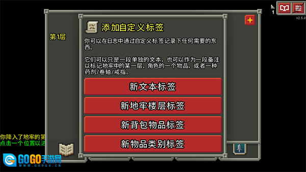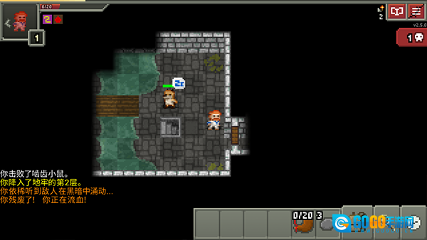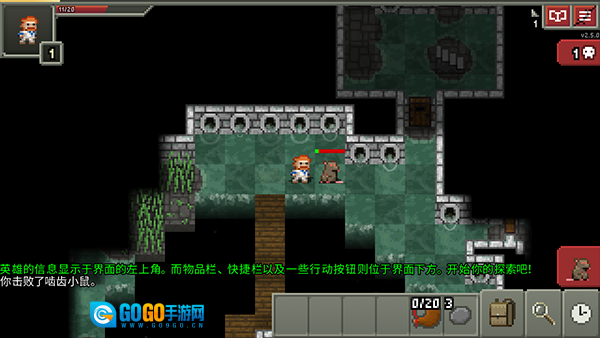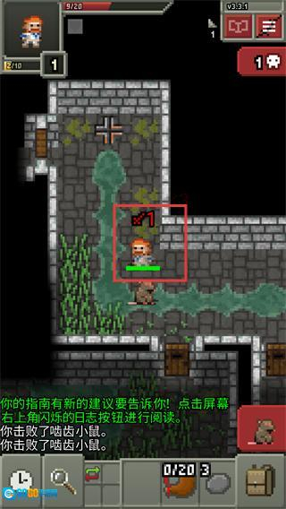 3、地牢场景里红框标注了角色状态(-x1),提示需要击败【啮齿小鼠】,此时指南会出现新的建议,可点击右上角的【日志】按钮查看具体内容。