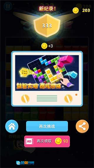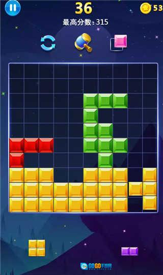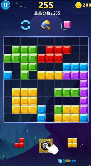 玩家需要在画面里把界面下方随机生成的三个方块拖到方格中,并且要排列出完整的行列来触发消除获取分数,直到方块没地方摆放时游戏就结束了。